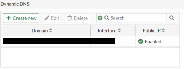 Once created, please allow a few minutes for the status to update. Public IP will become enabled and and your FortiDDNS domain will resolve to the correct IP address.